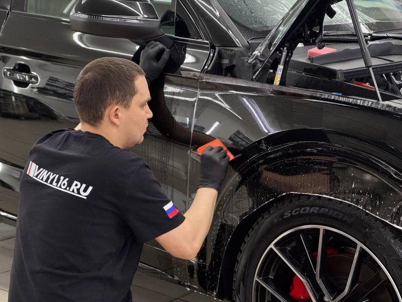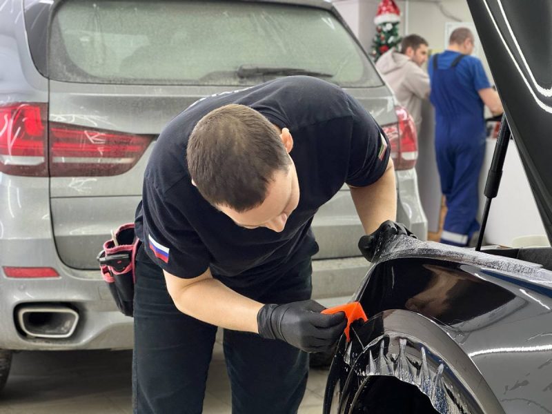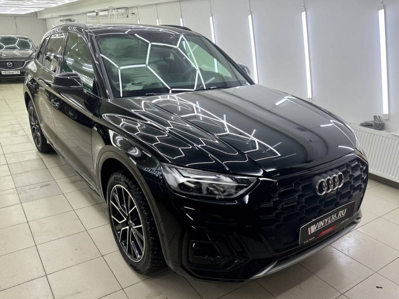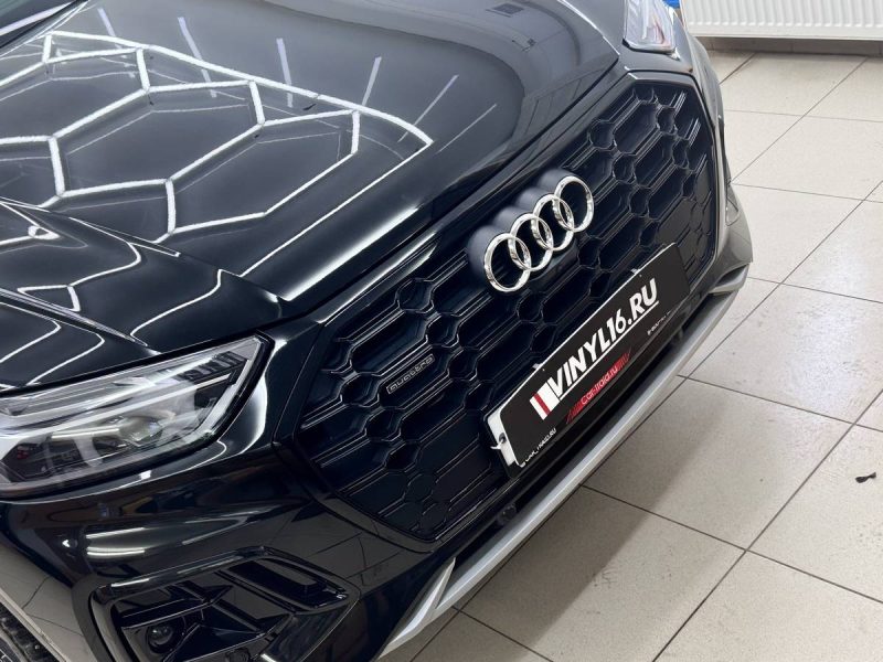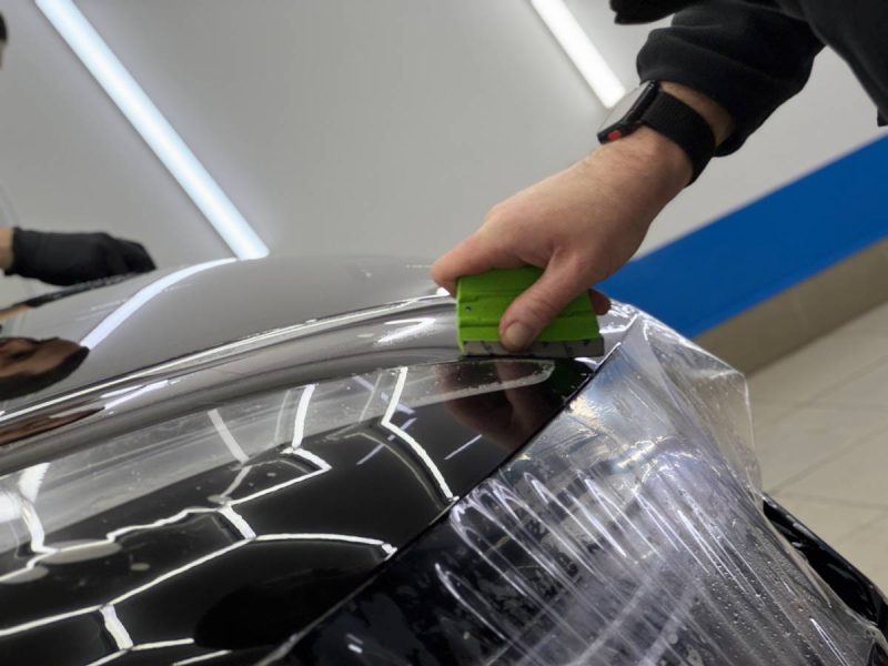 Сделали частичное бронирование глянцевой полиуретановой плёнкой. В оклеенными нами элементы вошли капот, крылья, передние фары и полоса над лобовым стеклом. Кстати, эти элементы входят в зоны риска, то есть более подвержены внешним физическим и химическим элементам.