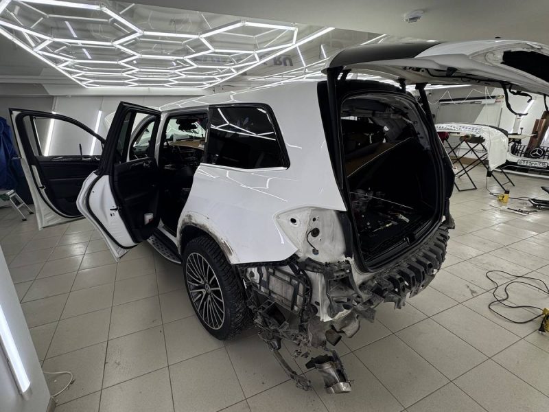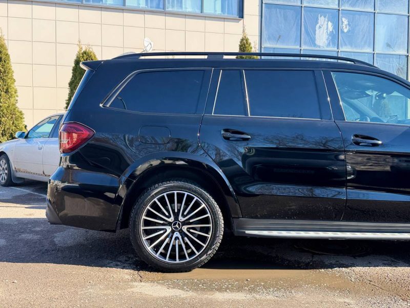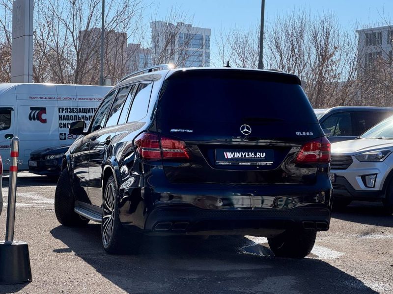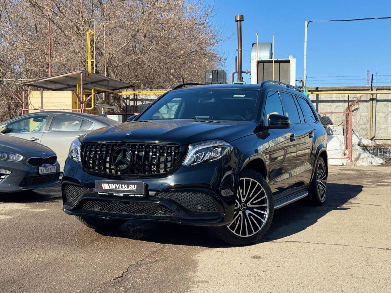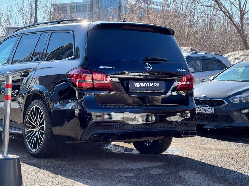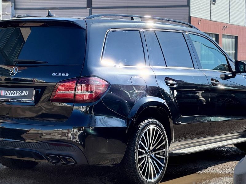 Речь идёт о цветной полиуретановой плёнке. На Mercedes GLS мы использовали в плёнку черного цвета, и оклеили кузов с проёмами. Она сделала автомобиль более «статусным», а также защитит родное ЛПК от внешних химических и механических повреждений.